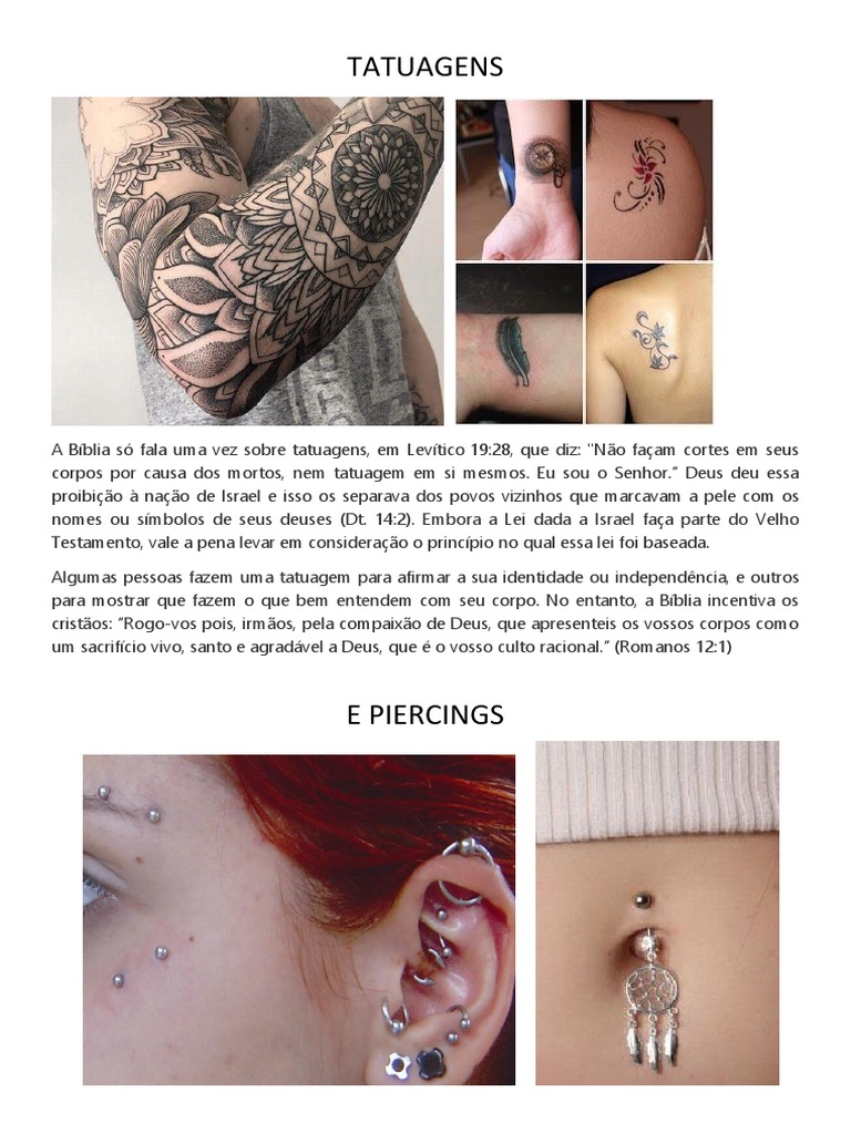 Algo cintra o piercing e tatuagem. Nunca fiz tatuagem mas tive piercing no umbigo e 2 no nariz. Homem e mulher os criou. Símbolos da Nova Era desenhos de escorpiões serpentes dragões formas sensuais figuras. Você corre o risco de ficar com uma inflamação horrível e aí não vai conseguir esconder isso dos seus pais. As tatuagens são quase piores que os piercings pois não devem esquecer que uma forma é um receptáculo de energia. Portanto quer comais quer bebais ou façais outra qualquer coisa fazei. Creio eu que o piercing e a tatuagem são figuras frequentes no cotidiano da criançada Atores têm pessoas na rua têm eles têm o. Como a orelha e o nariz são formados por cartilagem a recuperação é mais rápida explica Cristina. Piercing e Tatuagem. Em relação às tatuagens e piercings um bom teste é determinar se podemos ou não com honestidade e sã consciência pedir a Deus que abençoe e use esta atividade particular para Seus bons propósitos. Se por exemplo mandam gravar no vosso corpo uma caveira ou coisas totalmente negativas.